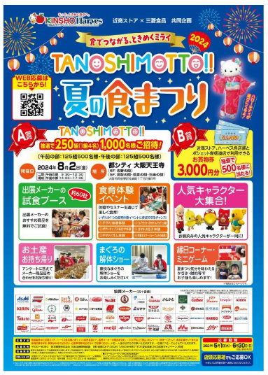 近鉄グループの(株)近商ストア(大阪府松原市、上田尚義社長)は8月2日(金)、日頃の感謝を込めて「TANOSHIMOTTO!!2024 夏の食まつり」を開催する。