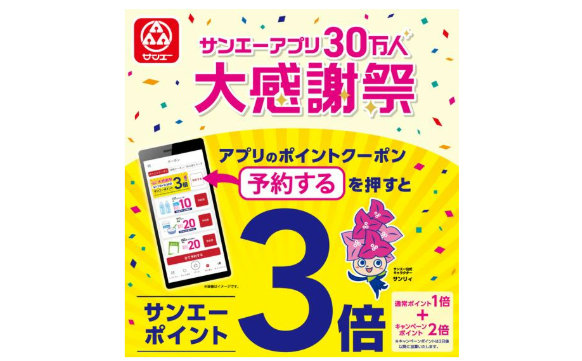 期間は5月17日(金)~5月30日(木)。特典として、衣料館・食品館・化粧品コーナー・ネットスーパーオンラインショップの買い物を対象に、アプリのポイントクーポンを予約すると、押した日の買い物分からポイントが3倍になる。
