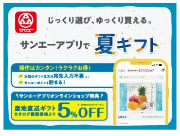 「サンエーアプリ オンラインショップ」は、サンエーアプリ内でギフト購入が可能となる。産地直送ギフトはカタログ掲載価格より 5%OFFとなり、税込み5000円以上の買い物で100ポイント貯まる。6月上旬オープン予定。