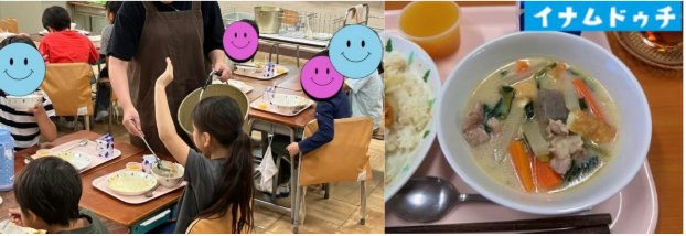 提供された「イナムドゥチ」は、豚肉やこんにゃく、かまぼこなどが入った白味噌仕立ての汁物で、旧正月のお祝い、卒業式、入学式など「おめでたい日に食べる料理」。各学校の栄養士がレシピを参考に「イナムドゥチ」を調理。それに合う他のメニューも考え、とても美味しい「沖縄給食」となった。