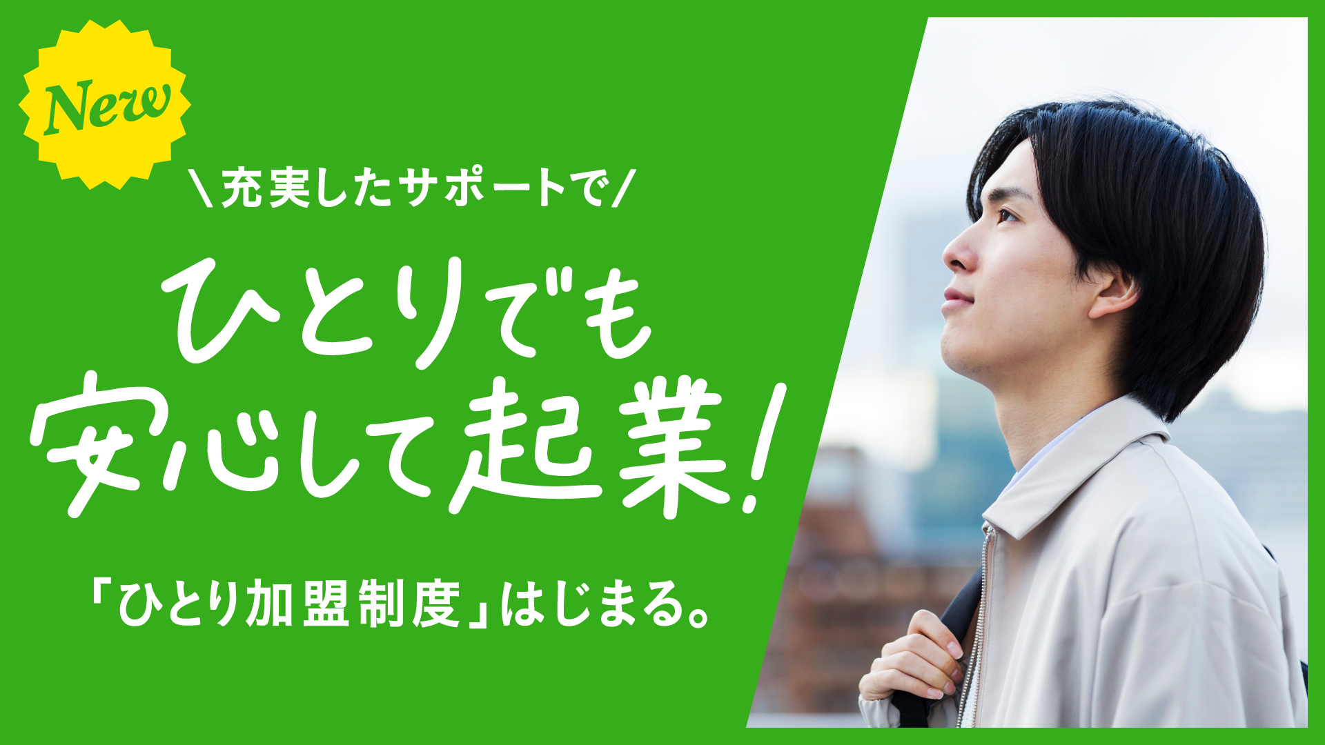 「ひとり加盟制度」は、店舗での勤務や店舗経営の経験がなくても一人でフランチャイズ経営ができるよう、開店時フォローやスタッフ募集支援、スタッフ育成支援、スタッフ不足時対策といった金銭面でのサポートなど、さまざまな支援体制を整える。