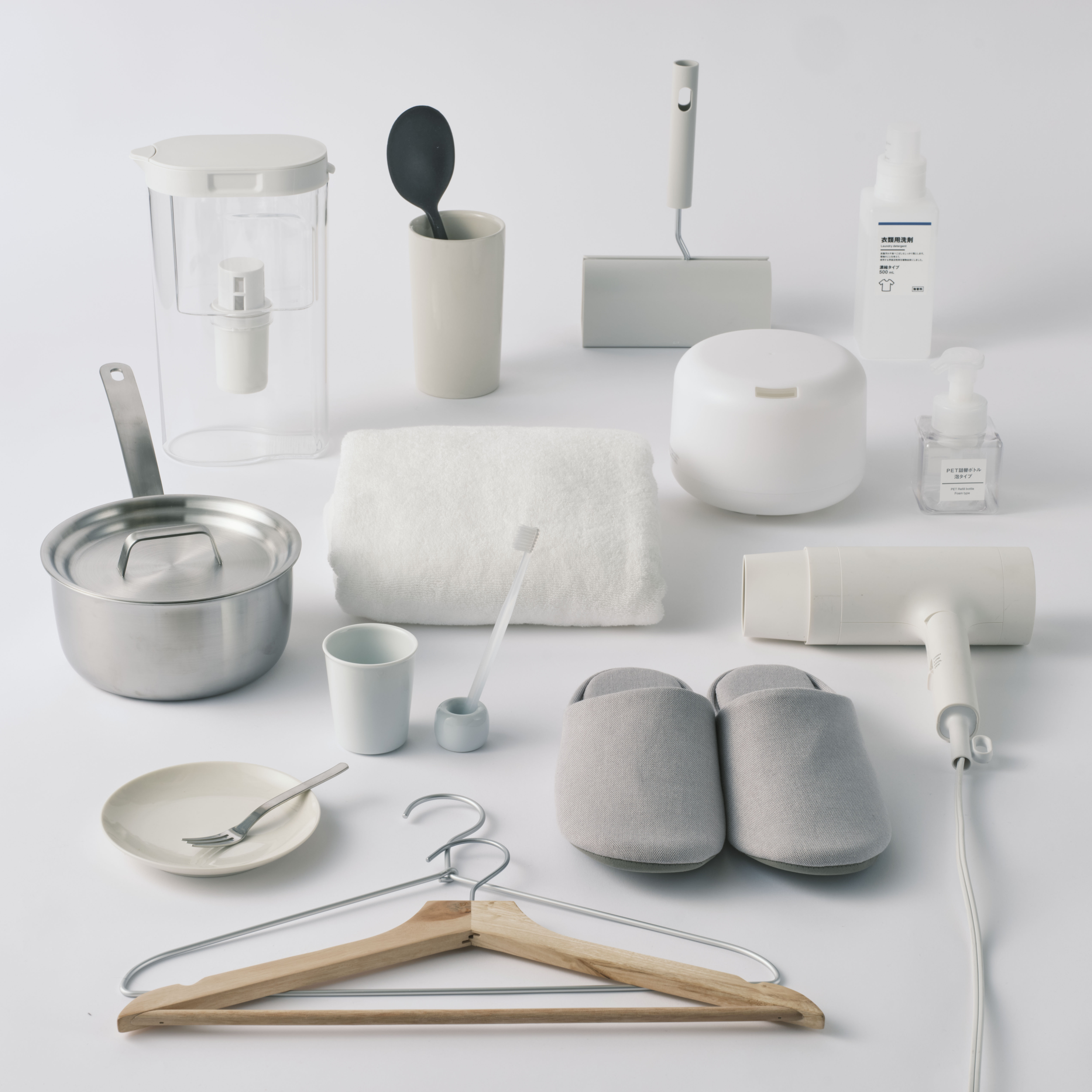提供するキットは食器セット、洗面セット、玄関セット、寝具セット、アメニティセットなどで、良品計画らしいシンプルで機能的な永く使えるデザインを採用している。