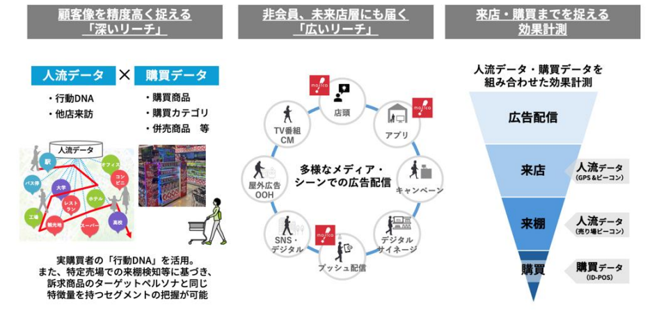 PPIHは国内620超の店舗での購買データと国内1400万以上のユーザーを有する「majicaアプリ」の購買データをもつ。これにunerry が保有する3.9億ID(うち国内1.5億ID)の人流ビッグデータとを掛け合わせることで、メーカー企業向けの新たなリテールメディアサービスを実現させる。