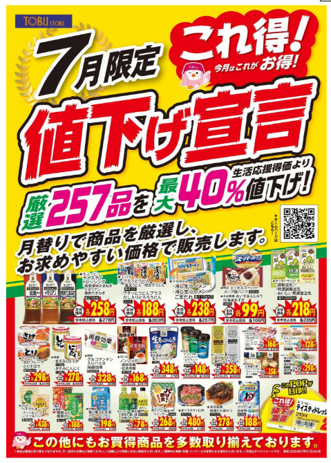 (株)東武ストアは7月に「これ得!値下げ宣言」として、食品・生活用品の厳選257品目を最大40%値下げする。