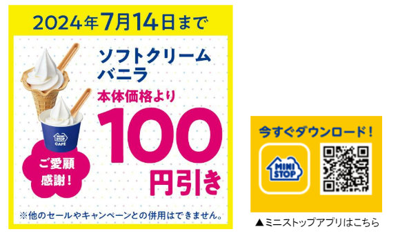 4万5111件の投稿記念として、ミニストップアプリでソフトクリームバニラ(コーン・カップ)の本体価格より100円引きとなるクーポンを配信する。クーポン配信と利用期間は、6月29日(土)15:00~7月14日(日)23:59まで。
