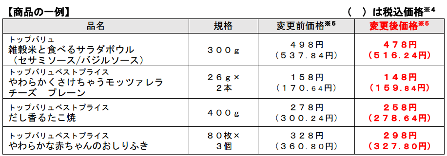 流通スーパーニュース > 戦略 > イオン北海道news|道内170店舗で「トップバリュ」最大26品目を値下げ イオン北海道news|道内170店舗で「トップバリュ」最大26品目を値下げ 戦略 / 2024年07月03日 ツイート イオン北海道(株)(札幌市白石区、青栁英樹社長)は7月3日(水)から、「イオン」「マックスバリュ」など、道内170店舗で、イオンのプライベートブランド「トップバリュ」最大26品目を値下げする。 イオン北海道の昨年から価格改定した品目は、累計で98品目となる。 イオングループでは全国約1万店舗で、「トップバリュ」32品目を値下げしていて、イオン北海道はそのうち26品目を扱う。 ツイート