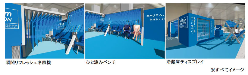 同イベントでは、夏の移動中に気軽にひと涼みができる「駅ナカ待合所」をコンセプトに、五感を総動員させる涼体験コンテンツを実施する。「触覚」ではエアリズムの機能性である接触冷感を表現した、冷たい強風を全身で浴びる「瞬間リフレッシュ冷風機」やエアリズム生地でできた「ひと涼みベンチ」、「視覚」では肌面平滑性を表現したエアリズム生地の涼しげなカーテン、「聴覚」では音で涼を感じる風鈴の展示、「嗅覚」ではエアリズムの爽快さを表現した香りの演出、「味覚」では「瞬間リフレッシュ冷風機」を体験した人に、毎日先着で塩ラムネとあわせてミネラルウォーターを配布する。
