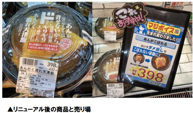 たとえば、5月にリニューアルされた「あんだく溺れ天津飯」税込価格430円。ドン・キホーテの弁当・惣菜の新ブランド「偏愛めし」第一弾商品として 23年11月に発売した。マジボイス上で「持ち帰る時斜めにならない様に注意しないと、隙間からつゆが溢れる。蓋と皿の隙間をラップで塞いで欲しい。」(原文ママ)というコメントを基に、約40種の容器から新たに餡の溢れづらい容器を選定した。リニューアル後も「改善されたという容器でも普通にアンはこぼれます」という声もあり、さらなる容器開発に取り組んでいると言う。