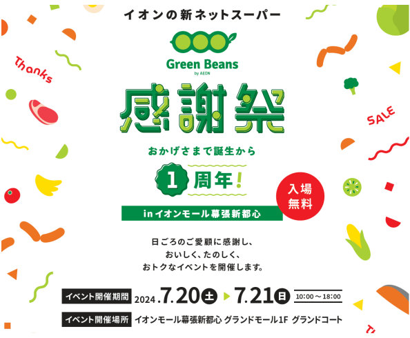 オンラインマーケット「Green Beans」を展開するイオンネクスト(株)(千葉市美浜区、バラット・ルパーニ社長)は 7月20日(土)から7月21日(日)、イオンモール幕張新都心で「グリーンビーンズ感謝祭~おかげさまで誕生から1周年 in イオンモール幕張新都心~」を開催する。
