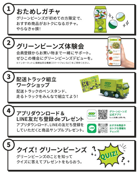 さらに体験ブースでは、グリーンビーンズで初めて買い物をした人限定で、お得クーポンが入ったガチャの参加や配送トラック組み立てワークショップ、クイズに答えてプレゼントがもらえる「クイズ!グリーンビーンズ」などが開催される。