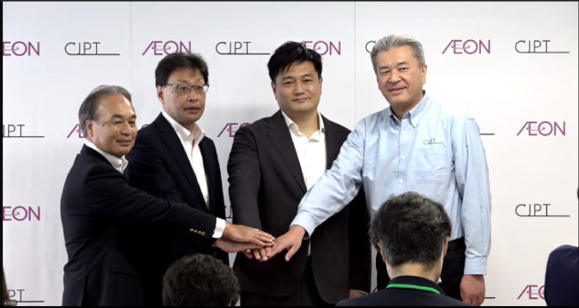 写真左から柴田祐司イオン九州取締役相談役、中川イオン九州社長、手塚イオングローバルSCM社長、CJPT中嶋社長