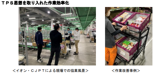 フェーズ1として2021年4月からイオングローバルSCMの南大阪RDCで協業を開始した。イオンの物流ノウハウとTPS(Toyota Production System トヨタ生産方式)の思想を組み合わせ、モノの流れの見える化・整流化を目指し「物流センター内作業改善による積載率向上」や「リアルタイムデータを活用した最適配送」を実現した。その結果、トラックの総走行距離を10%効率化、CO2排出量も10%削減した。