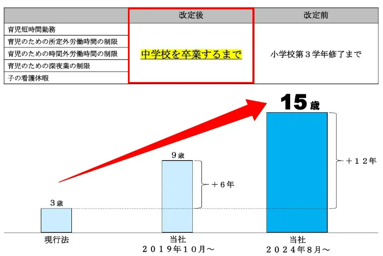 今回、より一層育児と仕事が両立できる環境づくりを目指し、育児短時間勤務および子の看護休暇等の対象期間をさらに6年間延長して「中学校を卒業するまで」とした。