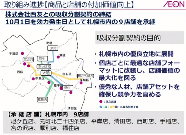 イオン北海道(株)(札幌市白石区、青栁英樹社長)は、今年10月1日を効力発生日として、西友から承継する札幌市内9店舗の改装について計画を発表した。