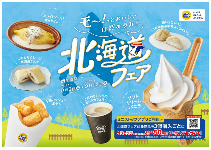ミニストップ(株)(千葉市美浜区、藤本明裕社長)は9月3日(火)から9月12日(木)まで「北海道フェア」を全国の1829店舗(2024年7月末時点)で実施する。