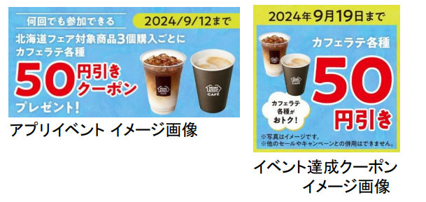 また、北海道フェア実施期間中、対象商品を3個購入ごとに、カフェラテ各種50円引きクーポンをプレゼントするアプリイベントを実施する。