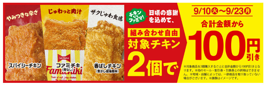 (株)ファミリーマート(東京都港区、細見研介社長)は9月10日(火)から9月23日(月)までの2週間、日頃の感謝を込めて、ファミチキ(骨なし)・スパイシーチキン・香ばしチキンの3種のうち組み合わせ自由で2個同時購入すると、レジで100円引きとなる企画を、全国のファミリーマート約1万6300店で開催する。