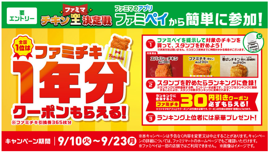 さらに、チキンセールと同時開催で、期間内にファミマのアプリ「ファミペイ」を提示して対象のチキンを購入した数を競う「ファミマチキン王決定戦」も実施する。ランキングに応じてファミチキ1年分クーポンなど、豪華プレゼントがもらえる。