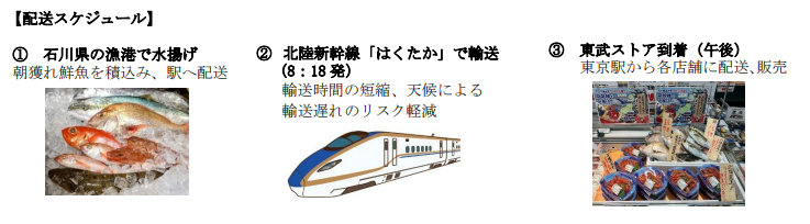 (株)東武ストア(東京都板橋区、木村吉延社長)は9月19日(木)から、北陸新幹線の列車貨物輸送サービス「はこビュン」を利用し、石川県内の漁港で当日の朝に水揚げされた鮮魚を、当日中に店頭で販売する。