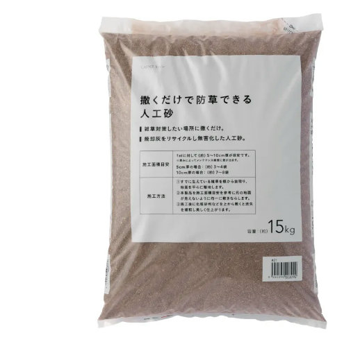 「撒くだけで防草できる人工砂」は、家庭ゴミを焼却した灰から生まれた防草できる人工砂。多孔質を有するため、地面に撒くと水はけが良くなり、雑草が根を張らず草抜きが楽になる。15kgで598円。