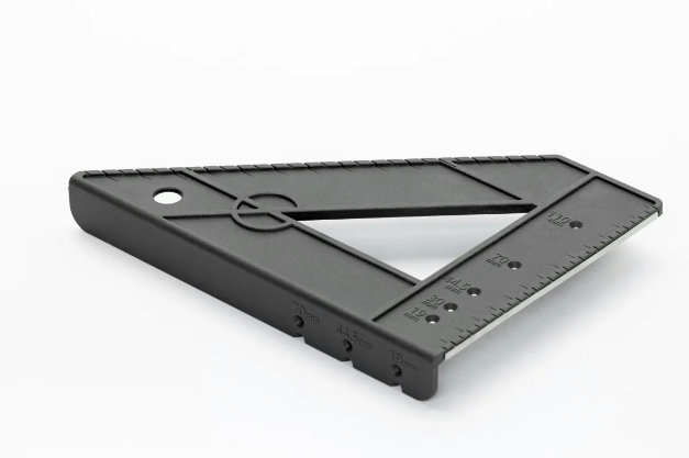 「丸鋸ガイド定規」は、プロの職人が使う便利な道具をDIY初心者向けにアレンジした商品。2×4材(ツーバイフォー材)の加工に特化し、丸鋸でまっすぐに切断するためのガイドだけでなく、木材切断後にもビス止めのマーキングや罫書ができるガイド付き。価格は1480円。