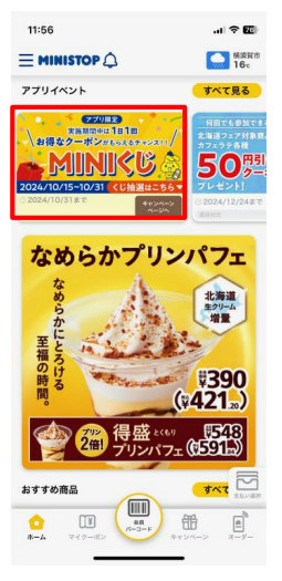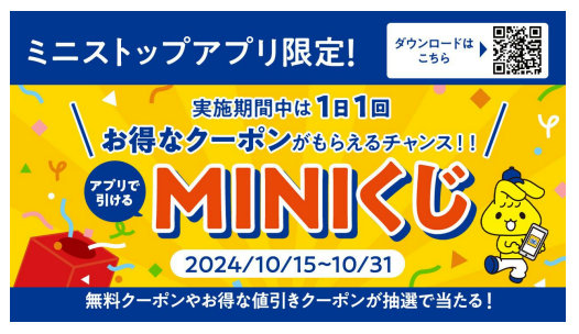 流通スーパーニュース > 戦略 > ミニストップnews|アプリ会員限定新企画「MINIくじ」10/15から開催 ミニストップnews|アプリ会員限定新企画「MINIくじ」10/15から開催 戦略 / 2024年10月17日 ツイート ミニストップ(株)(千葉市美浜区、藤本明裕社長)は10月15日(火)から10月31日(木)の期間、ミニストップアプリ会員向けの新企画として、1日1回ミニストップアプリ内で無料でくじが引ける「MINIくじ」を実施する。 「MINIくじ」は、購入条件無しで、1日1回アプリくじを引くと無料クーポンや値引きクーポンが抽選で当たる(ハズレもあり)。クーポンの利用期限は11月10日(日)まで。 ツイート