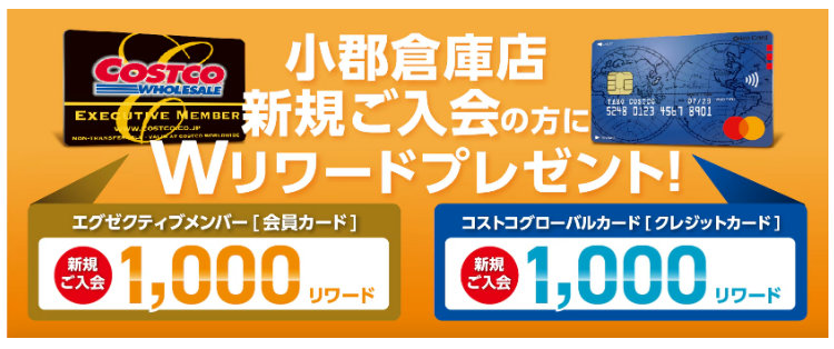 小郡倉庫店新規入会の時に、エグゼクティブ会員にアップグレードすると、1000円相当のエグゼクティブリワードをプレゼントする。さらに、コストコグローバルカードを申し込むと、1000円相当のキャッシュバックリワードをプレゼントする、おトクなスペシャルキャンペーンとなる。