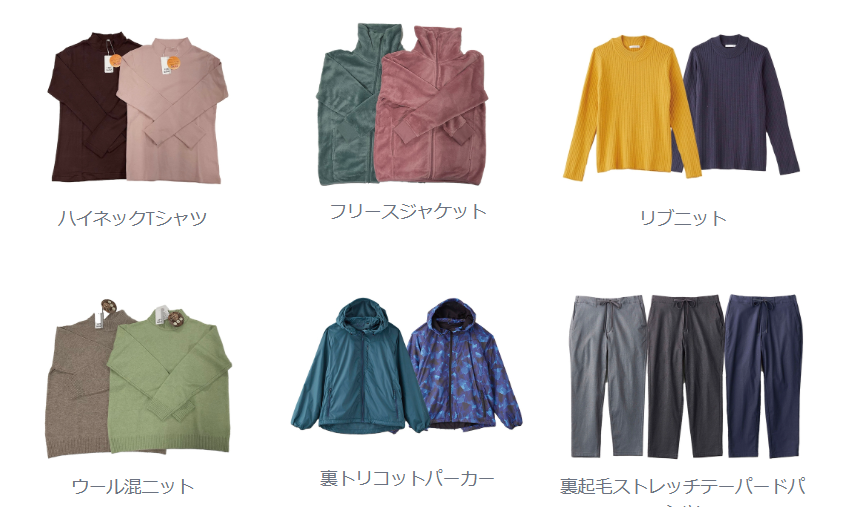共通キーアイテムは、ハイネックTシャツ、フリースジャケット、リブニット、ウール混ニット、裏トリコットパーカー、裏起毛ストレッチテーパードパンツの6アイテム。