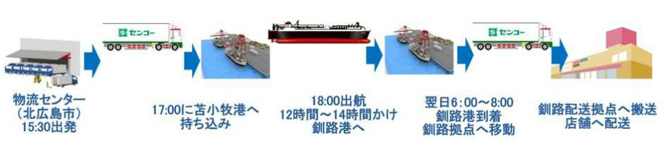 この取り組みでは、RORO船が運航する月・火・金・土曜日にくらしの品と衣料品の一部商品を配送する。食料品は、配送する量がトラックに積載しきれない場合にRORO船に積載する計画。この取り組みは順次拡大し、来春には釧路市内と厚岸町、根室市内の店舗でも実施する予定だ。