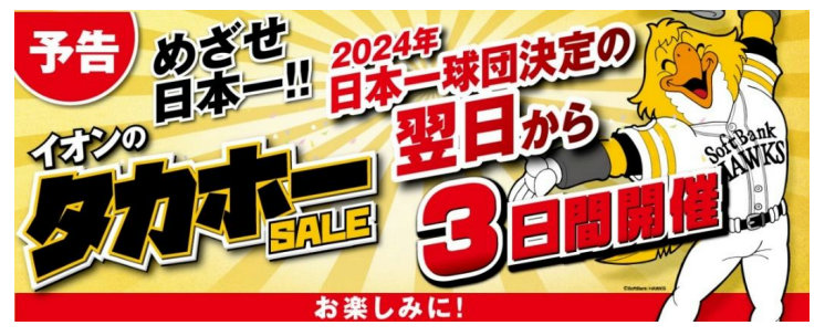 イオン九州(株) (福岡市博多区、中川伊正社長)は、2024年日本一球団決定の翌日から3日間、「イオンのタカホーSALE」を開催する。九州内の「イオン」「イオンスタイル」「マックスバリュ」「マックスバリュエクスプレス」「ザ・ビッグ」「イオンバイク」「ホームワイド」「ホームワイドプロ」など318店舗での開催となる。