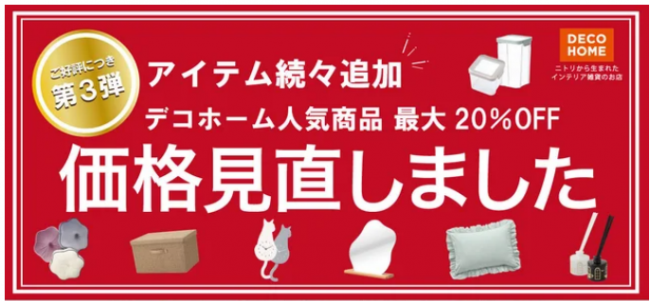 (株)ニトリ(札幌市北区、似鳥昭雄会長兼社長)は10⽉28⽇(⽉)から全国のデコホームとニトリネットで「”第3弾”価格⾒直し」を実施した。