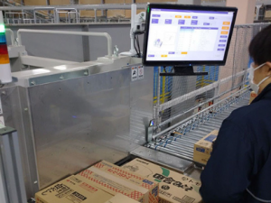 導入効果としては従来比で約45%の人時削減を目標とする。設備の特徴としては、発注商品の搬送やカゴ車へ積み付ける工程を自働化し、作業者は定位置の作業台上で、ディスプレイに表示された指示通りに、手元に流れてきた商品をカゴ台車サイズの枠にはめていく作業を行うことで店舗別仕分けが完成する仕組みだ。店舗単位の最適積み付けシミュレーションをもとに商品を積み付けることで、従来設備で発生していた、荷崩れ防止のために考えながら積み付けする作業や、積み直し作業が解消され、作業習熟度を考慮しない作業が可能となった。