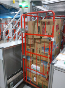 この設備は(株)ダイフクと共同開発を進めた国内初導入となる設備で、各店舗から発注を受けた商品を搬送用のカゴ台車に仕分け、積み付けする作業を半自動化することで、従来の作業者が商品を持つ、運ぶといった身体負荷が高い作業を大幅に軽減することが可能となった。