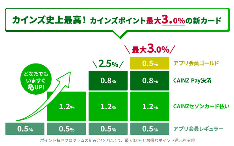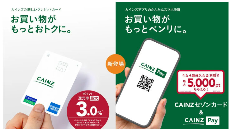 「CAINZセゾンカード」は、入会金は無料で、年1回以上の購入利用で年会費も無料。カインズアプリからの申し込みのみで、最短5分で審査は完了する。カインズの店舗・オンラインショップ、ベイシアグループ店舗(一部対象外有り)での買い物で、カインズポイントが1.2%還元。その他の加盟店での買い物でも、カインズポイントが1.0%還元する。「CAINZ Pay」との併用で、カインズアプリ「ゴールド」会員はカインズポイント3.0%の還元。「ゴールド」会員以外でも2.5%の還元となる。