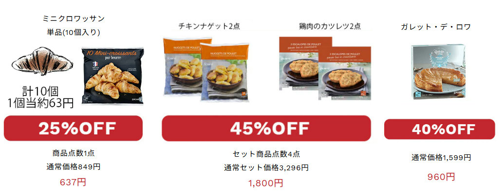一押しは、ピカールの看板商品「ミニクロワッサン」を通常価格より1点25%OFFに加え、買い上げ数に応じて割引率がアップし、最大10点で37%OFFとなる。そのほか、チキンを使った一品料理、フルーツ、デザートなど、多彩な単品商品を手ごろな価格で提供する。