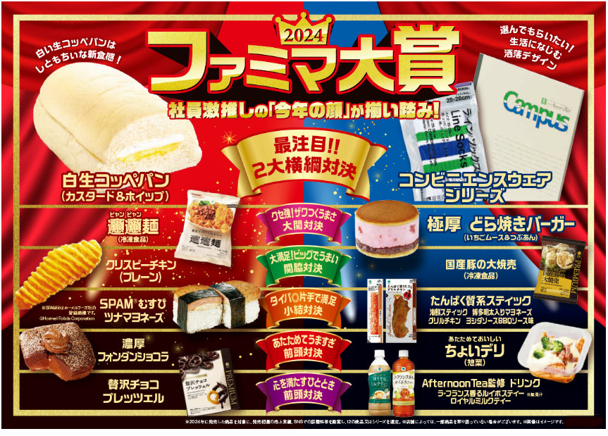 ファミリーマートは、2024年に発売・リニューアルした商品・サービスの中から今年1番おすすめしたいものについて商品を選定し、「ファミマ大賞」として紹介している。2023年に初めて実施した。今年は、新規性・話題性・売上げをもとに、東西番付になぞらえて「横綱、大関、関脇、小結、前頭」に分けて発表した。