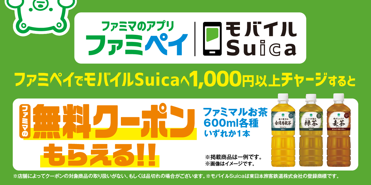 チャージ開始を記念してキャンペーンを実施する。キャンペーンにエントリーし、「ファミペイ」から「モバイルSuica」へ1000円以上チャージすると、もれなくプライベートブランドのファミマルお茶の無料クーポンを進呈する。