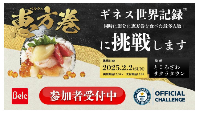 (株)ベルク(埼玉県鶴ヶ島市、原島一誠社長)は2月2日(日)、恵方巻を同時に食べる最多人数のギネス世界記録へ挑戦するイベントを行う。