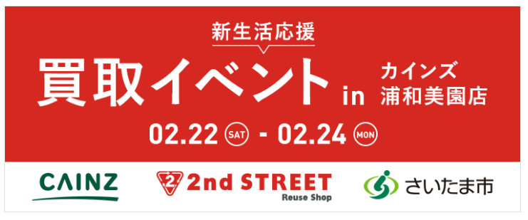 (株)カインズ(埼玉県本庄市、高家正行社長CEO)は2月22日(土)~24日(月・祝)の3日間、、(株)セカンドストリート(愛知県名古屋市中区、一戸綱樹社長)と埼玉県さいたま市(清水勇人市長)と協働し、カインズ浦和美園店で「新生活応援買取イベント」を実施する。