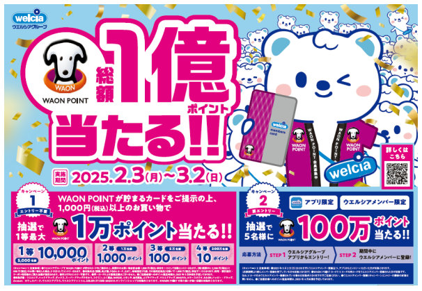 ウエルシア薬局(株)(東京都千代田区、田中純一社長)は2月3日(月)から3月2日(日)の期間、「WAON POINTが総額1億ポイント当たる!!」キャンペーンを開催する。