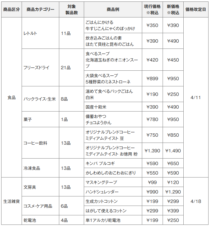 しかしながら、気候変動などを理由に綿やコーヒー豆などの原料価格の高騰、物流費の高騰、さらに円安が進行しており、企業努力によるコストの吸収が厳しい状況となった。今後もこの傾向が続くと予想されることから、食品67品目、生活雑貨23品目、計90品目の商品について、価格改定(値上げ)を行うこととした。