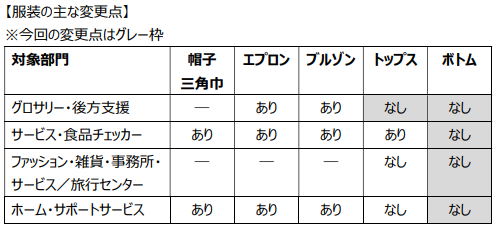 気温や体調の変化に応じて服装を変えられるよう、制服の見直しを行い、服装を一部自由化する。またカーディガンやスカートといった女性のみに貸与されていた制服は廃止し、全従業員に同じ服装基準を採用する。