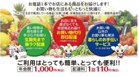 「買い物代行」サービスは、年配者も安心、簡単に利用できるよう、インターネットではなく電話やファックスで注文を聞いて、自宅まで配達する。店舗で販売している商品を中心にチラシ広告や会員に配布している「ホーム・サポートサービス商品カタログ」からも注文できる。