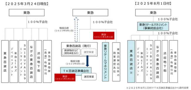 TK百貨店準備会社は同日に商号を(株)東急百貨店に変更する。東急グループは東急線沿線を中心に、地域特性に合わせた独自性のある商業施設を展開してきた。特に、渋谷を最重要拠点と位置付けて、若者をターゲットとする新しいコンテンツの創造や、フードやビューティなどの分野では、インバウンド需要の取り込みなどにより、グループビジョンである「エンタテイメントシティSHIBUYA」の実現の一翼を担ってきた。