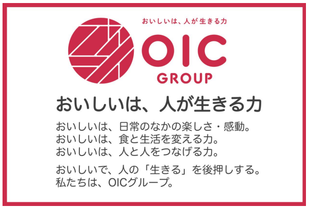 また、新ロゴでは、日本にしかないカタカナの「オイシイ」を印鑑風のデザインに入れ込んでいて、日本発の企業であるOICグループが実現する品質を、安心安全ワクワク感の<保証マーク>のように表現したマークデザインとなっている。右肩上がりの白いラインは、常に新しさ、向上心を表現し、カタカナである「オイシイ」をデザインしている。