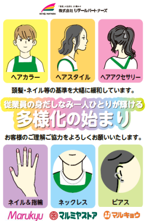 (株)リテールパートナーズ(山口県防府市、田中康男社長)は3月16日から、リテールパートナーズの事業会社3社(丸久グループ・マルミヤストアグループ・マルキョウ)で、新しい身だしなみ基準を導入している。