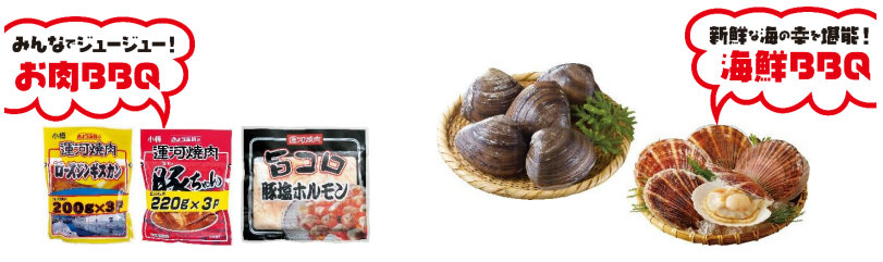 4月25日(金)から4月27日(火)までの期間は、「共栄食肉 きょうえいのお楽しみ袋」2000円(本体価格、以下同)や、「北海道産/活北寄貝(生食可)」198円/1個、「北海道産/活ほたて貝」158円/1個などを用意する。