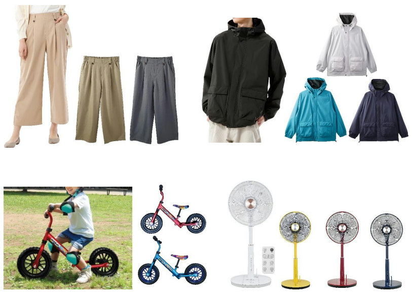 4月25日(金)から5月6日(火・休)までの期間は、「サラチノパンツ」2384円や、「HAJIC 裏メッシュフーディー」3984円、「バランスバイク アルミマット」7480円、「おおたけ フルリモコン リビングDC扇風機」5980円などを展開する。