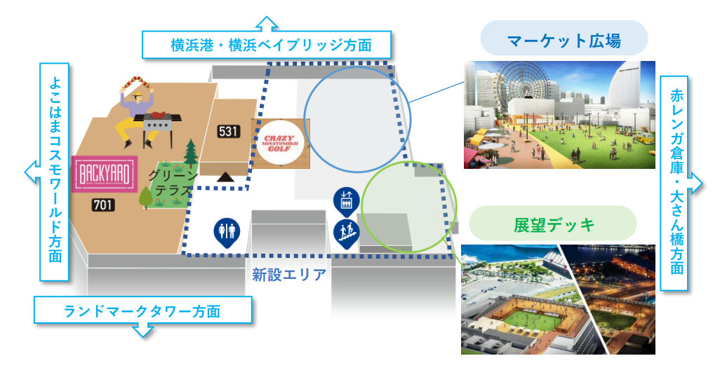 昨年に続くエンタメモールへのリニューアルとして、屋上に全体で約5600㎡の開放的なテラスエリアを新設する。「みなとみらい全方向の景観が展望できるデッキ」や「スポーツ・イベントを楽しむ広場」をつくり、何度でも来たくなる空間を創出する。
