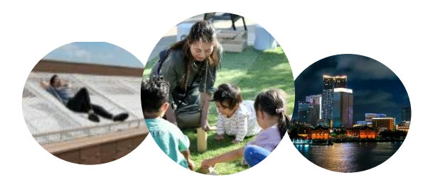 「展望デッキ」は、赤レンガ倉庫~大さん橋側に位置し、みなとみらいエリアの全方向を見ることができる。約2200㎡の空間に、芝生広場や空を仰げるハンモックを設置。写真撮影や日向ぼっこなど、楽しい時間を過ごせる。